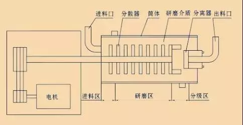 預先進行分散潤濕處理的固-液相混合物料經(jīng)計量泵,從臥式砂磨機上部進料管輸入筒體內,電動機帶動主軸上的分散器旋轉產(chǎn)生動能,物料和筒體內的研磨介質一起被高速旋轉的分散器攪動,從而使物料中的固體微粒和研磨介質相互間產(chǎn)生強烈的碰撞、摩擦、剪切作用,介質間的物料粒子受力變形并產(chǎn)生應力場。當應力達到顆粒的屈服或斷裂極限時,便產(chǎn)生塑性變形或破碎。未被粉碎的顆粒受離心力作用被甩向砂磨機筒壁,此區(qū)研磨介質密度最大,從而強化了粉碎作用,粉碎后的微小顆粒經(jīng)分離器與研磨介質分離后,從出料管流出。